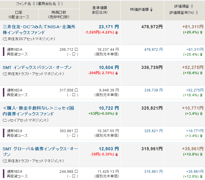 NYダウと日経平均のダダ下がりを見ると、つい買い増しをしたくなるところですが、これくらいの下げでは含み益を保っています。どのファンドも含み損を抱えるくらいにならないと、この先株価が戻った時も効果は薄いでしょう。