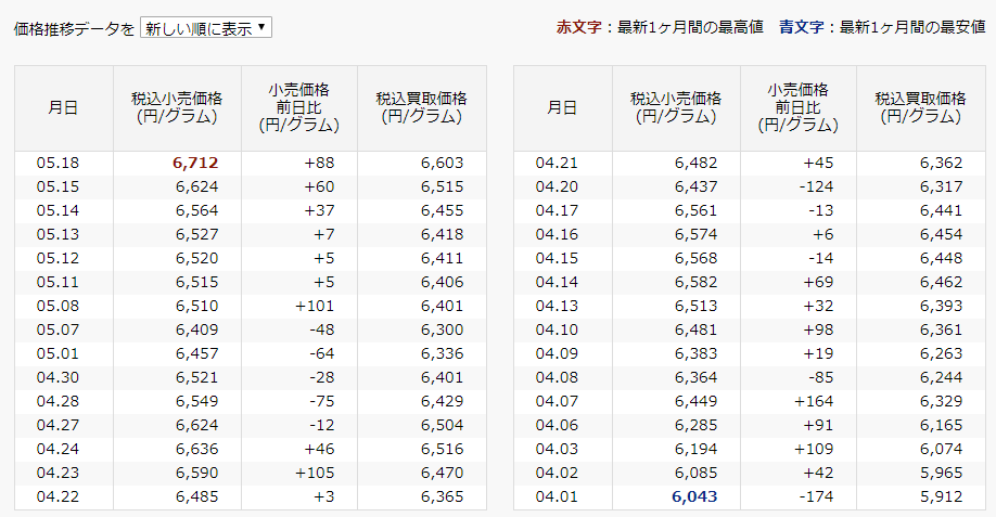 小売価格で6,712円!です。文字が赤く染まっています。最高値です。私は永年、少額ではありますが田中貴金属で積み立てをしてきました。金は利息を生まないから金投資は不要、と指摘する方も多くいます。